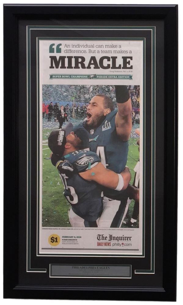 When they are gone, they are gone. These newspapers were only given to players on the field after they won the superbowl! Modern black solid wood newspapers and periodicals frame made to display the philadelphia inquirer or any other media measuring 11x22 inches. Exclusive sb 52 signed memorabilia. Philadelphia eagles super bowl lii champions 8x10 photo clock plaque with engraved nameplate with season results giftsforsportsfans $ 52.98 free.