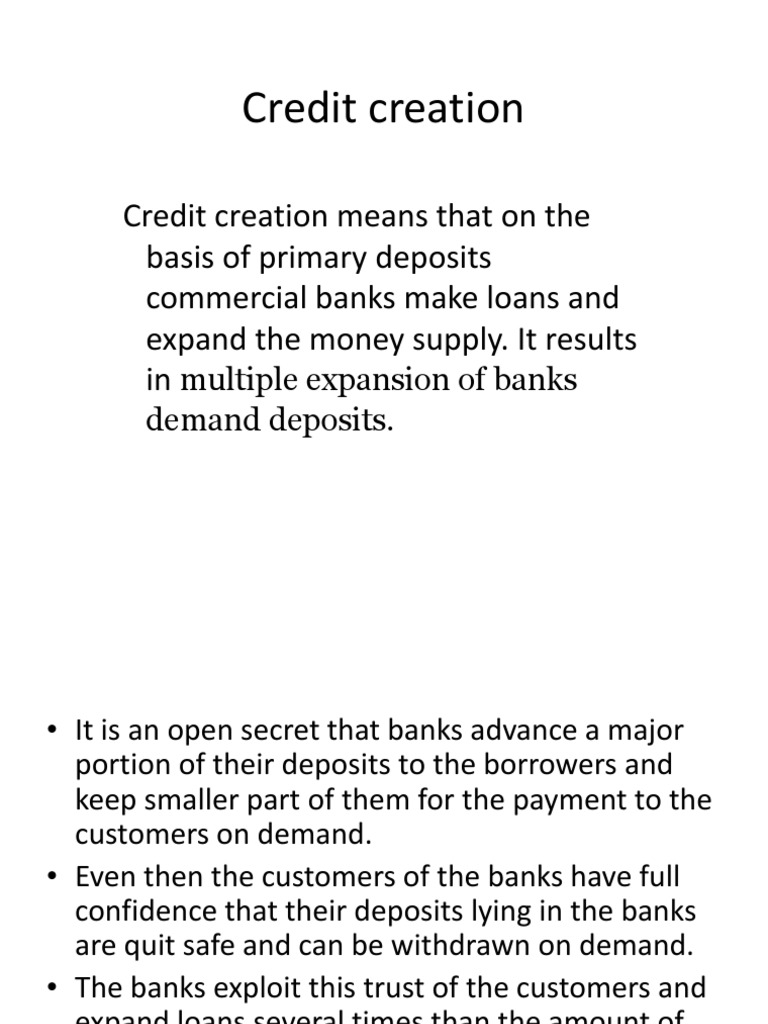 If we expect that the bank needs to keep a crr of 20%. Bank deposit creation or credit creation or money multiplier the ability of the commercial bank system to create new bank deposits and hence increase the money supply.commercial banks accept deposits of currency from the general public. In above example lrr is 10%. Money creation the legal and economic lending capacity of commercial banks is predicated on the volume of business associated with creditworthy borrowers. It creates money based on cash deposits. In most modern economies, most of the money supply is in the form of bank deposits. Therefore, this process of credit creation leads depositors to believe that they have money with the bank. It is one of the most important activities of commercial banks. The minimum ratio of deposit, legally required to be kept as cash by the banks. In simple terms, credit creation is the expansion of deposits. A bank has sometimes been called a factory for the manufacture of credit. Money creation through the credit multiplier a large part of money creation is carried out by commercial banks that provide credit to their customers (individuals or companies). To understand the process of money creation today, let us create a hypothetical system of banks.